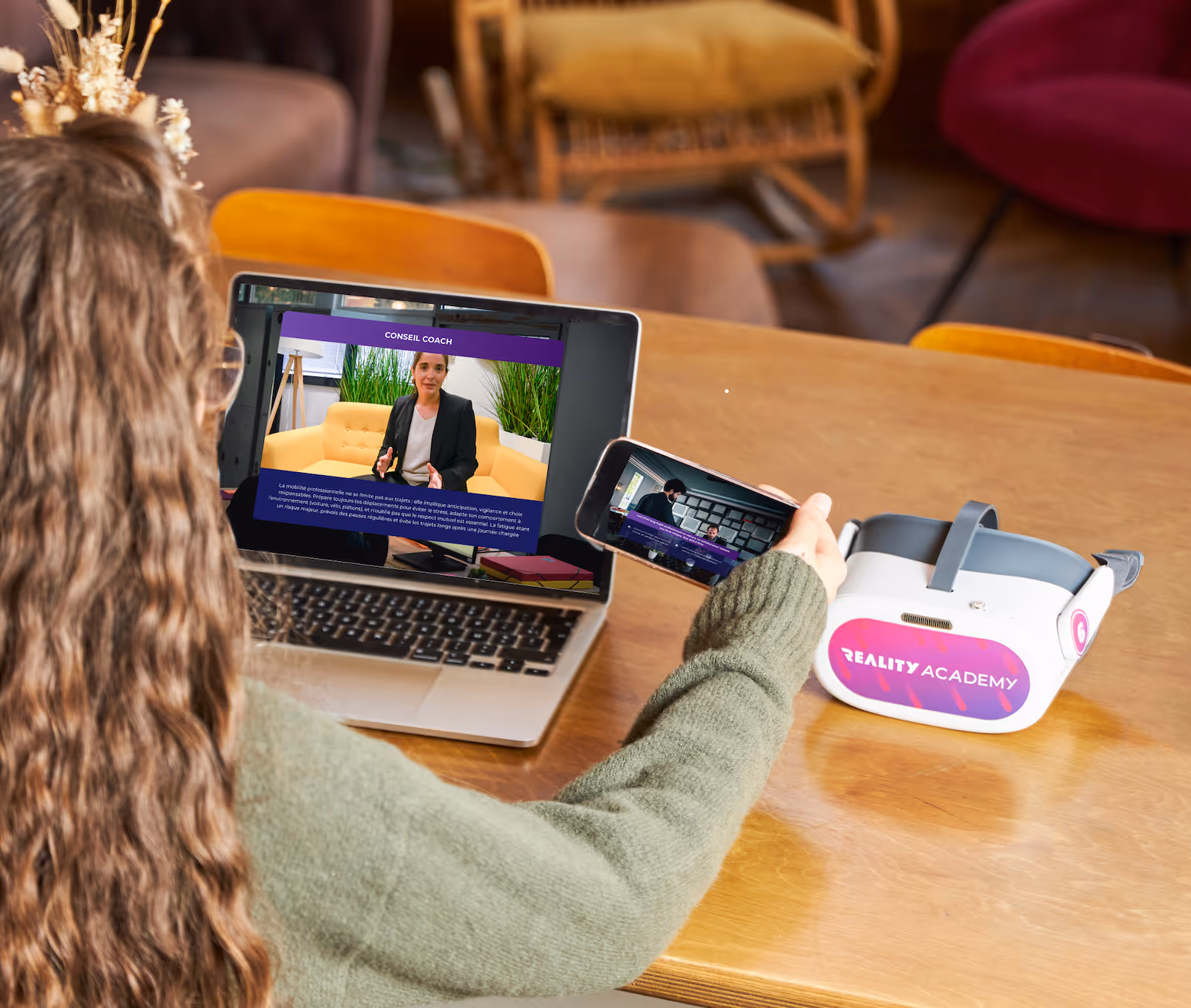 Pour mettre en place l’Immersive Learning, vous sélectionnez les formations les plus adaptées selon votre plan de formation parmi notre large catalogue : Management, Vente, Cybersécurité, Diversité et Inclusion, Sécurité Routière, Sécurité au travail, …Vous pouvez tester nos modules en amont du projet. Vous définissez le nombre de casque VR en fonction de vos apprenants, et nous envoyons le Pack VR chez vous ou directement chez vos salariés. Profitez d’une qualité de contenus pédagogique unique et boostez durablement les compétences de vos équipes !